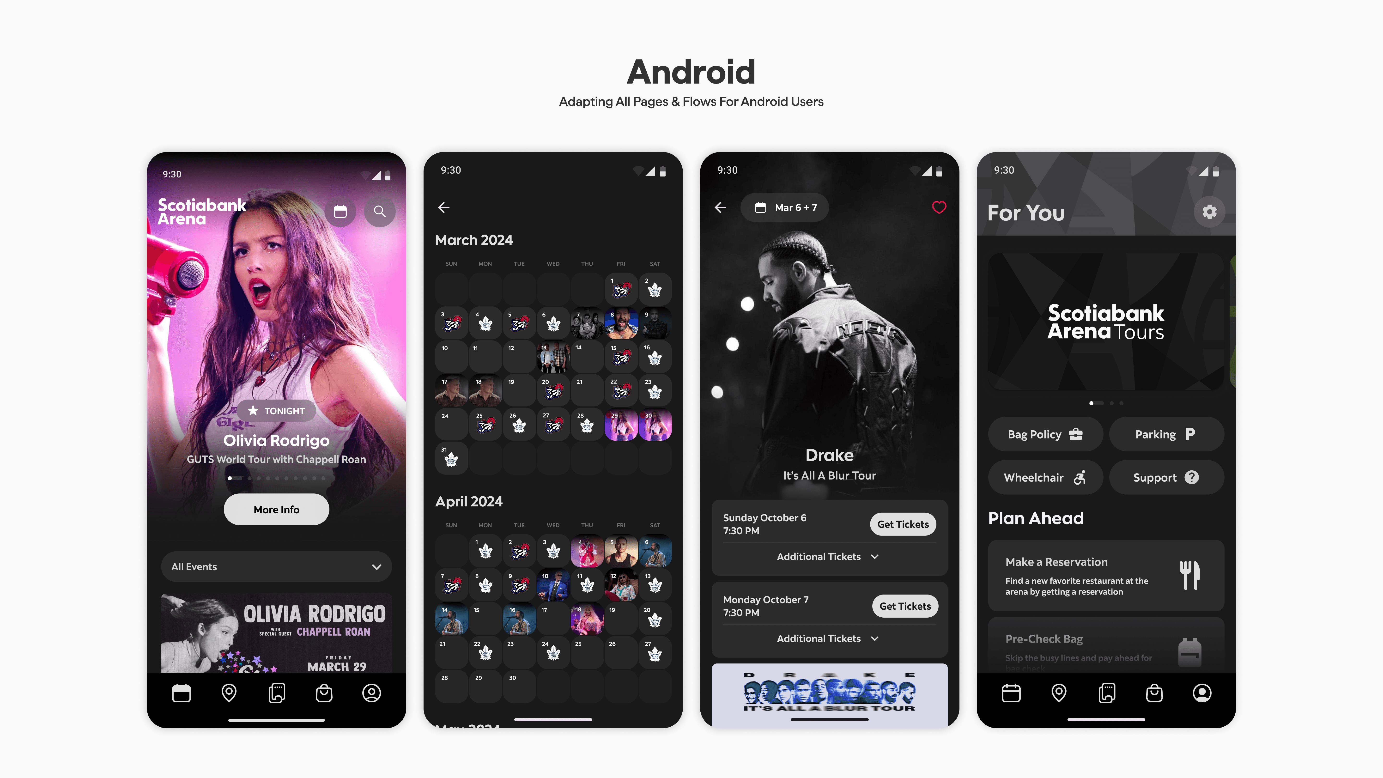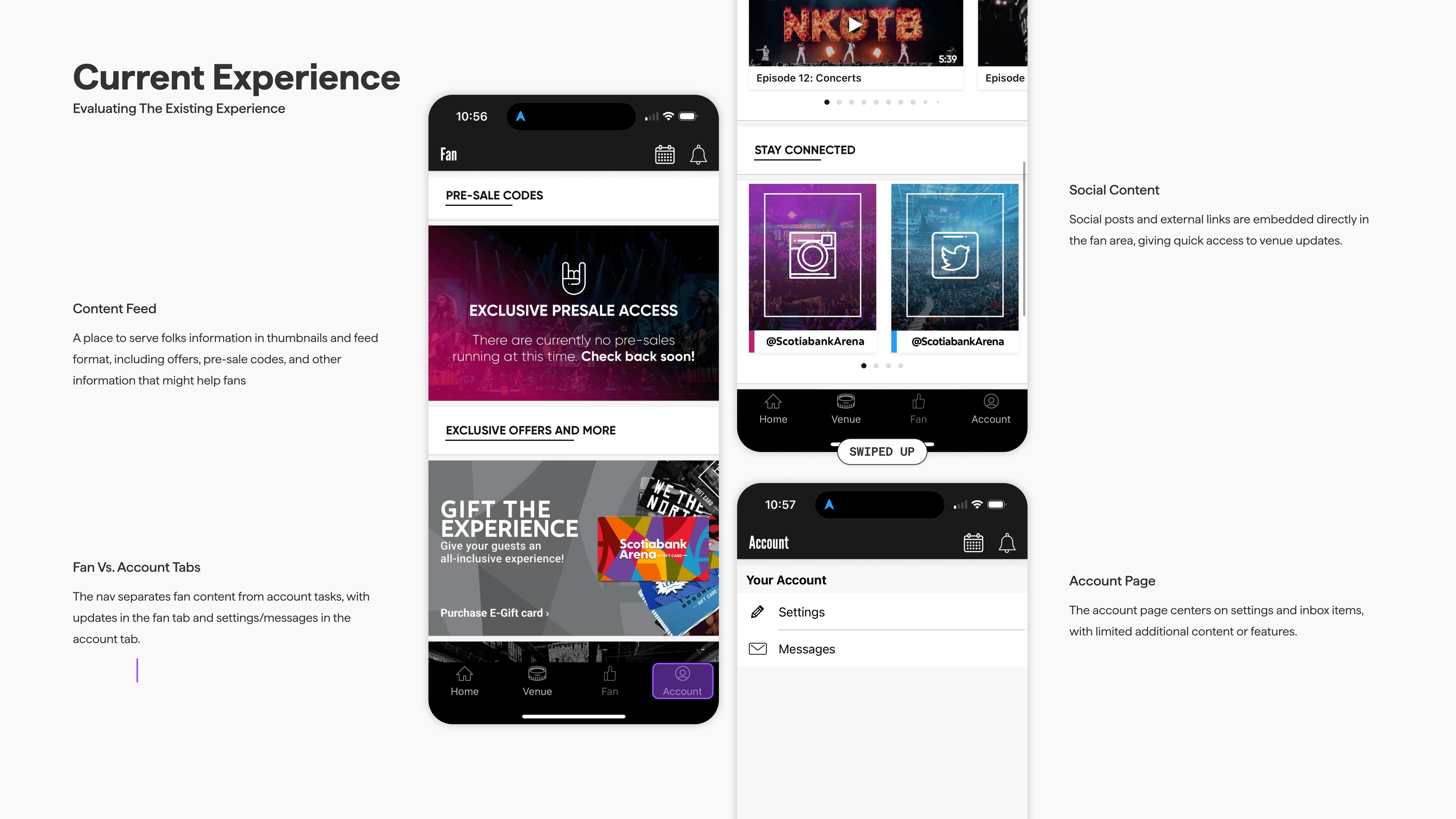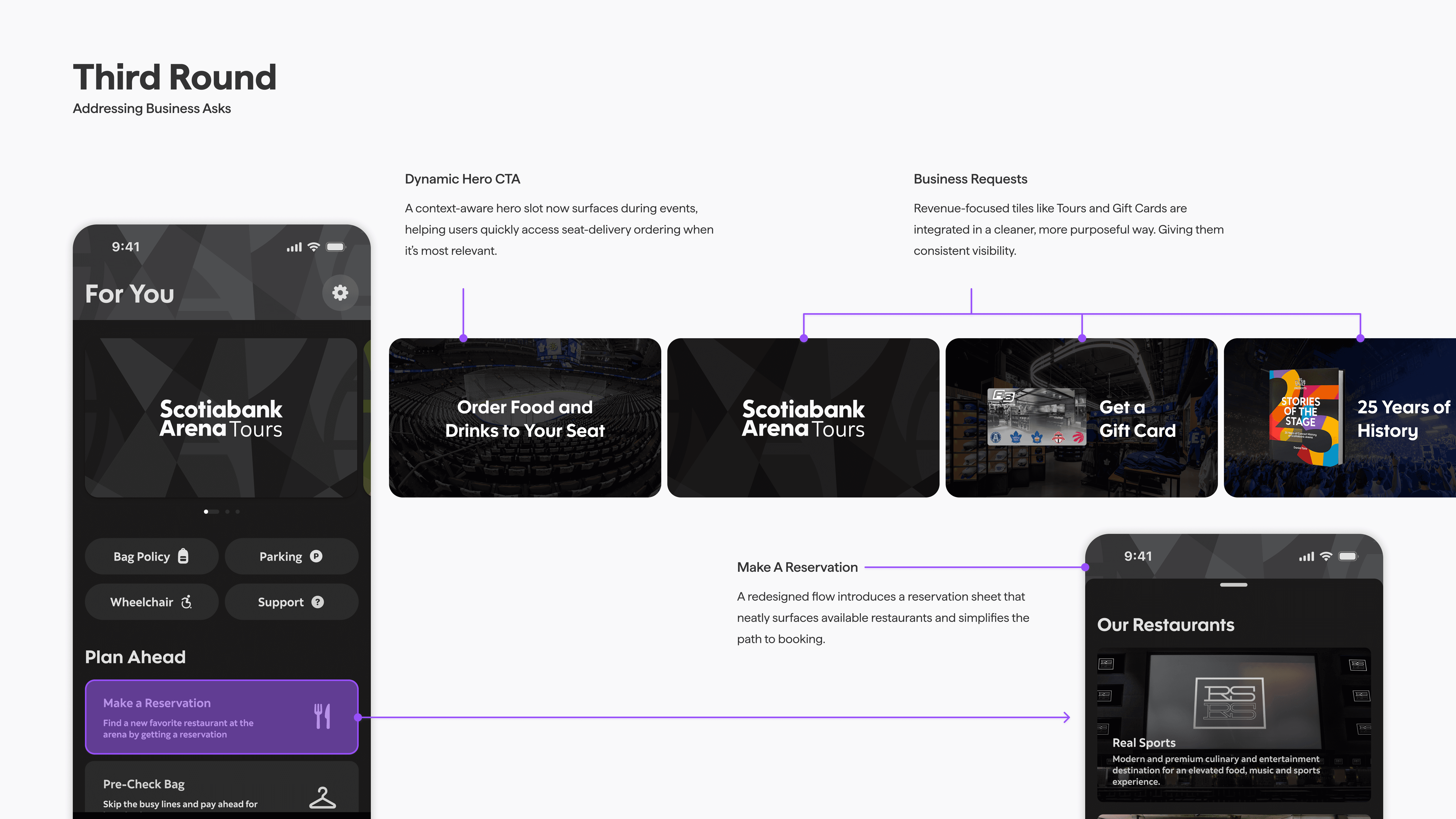 After launching the revamped native NHL app, MLSE shifted focus to reimagining the Scotiabank Arena app in parallel with major renovations happening inside the venue. With the existing app approaching its renewal with YinzCam, the organization saw an opportunity to modernize the experience and bring it in line with the arena’s broader transformation. A small cross-functional group including myself was brought in to help rethink core fan journeys, update visuals, and support the delivery of a refreshed, more intuitive app experience.