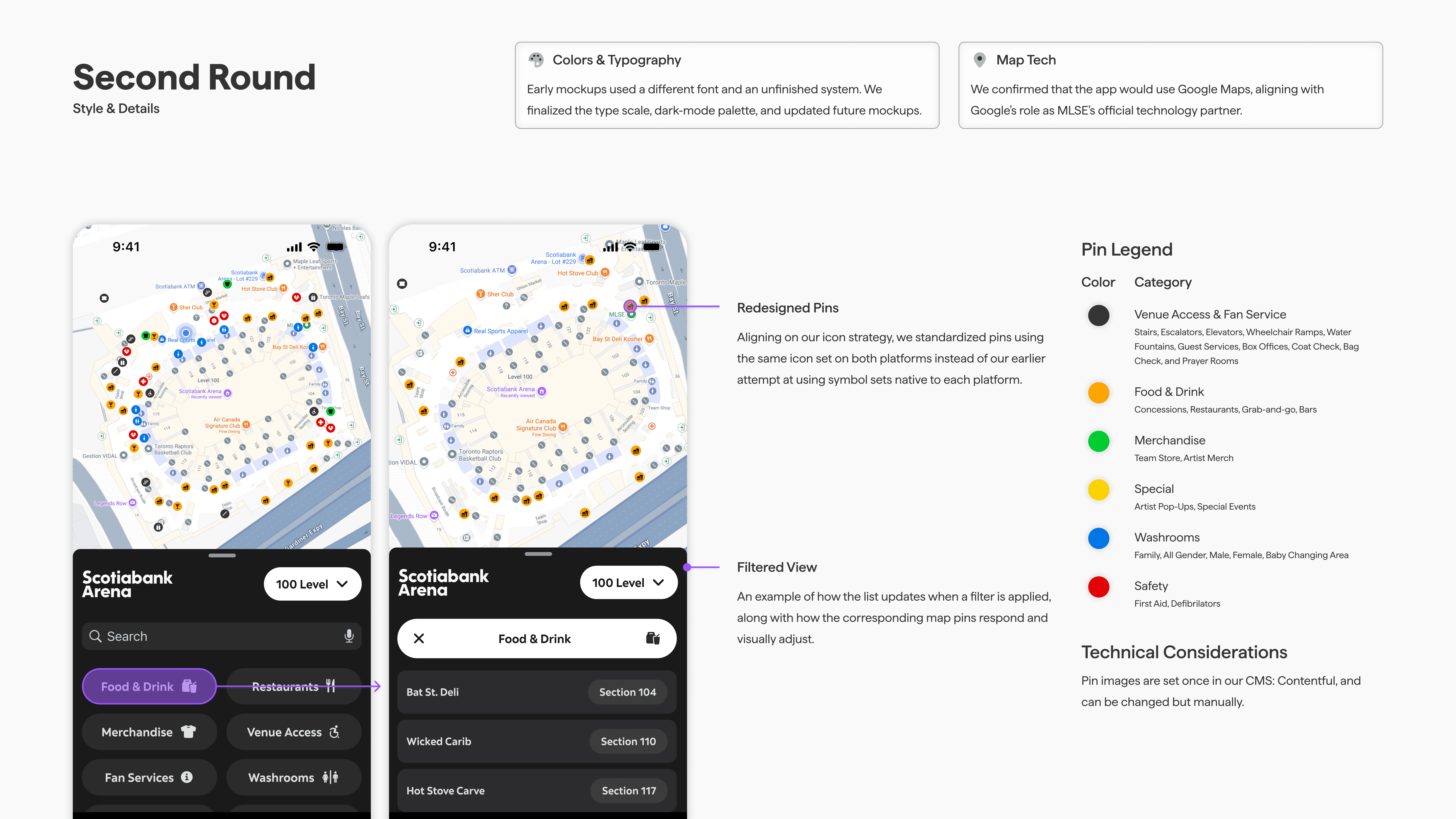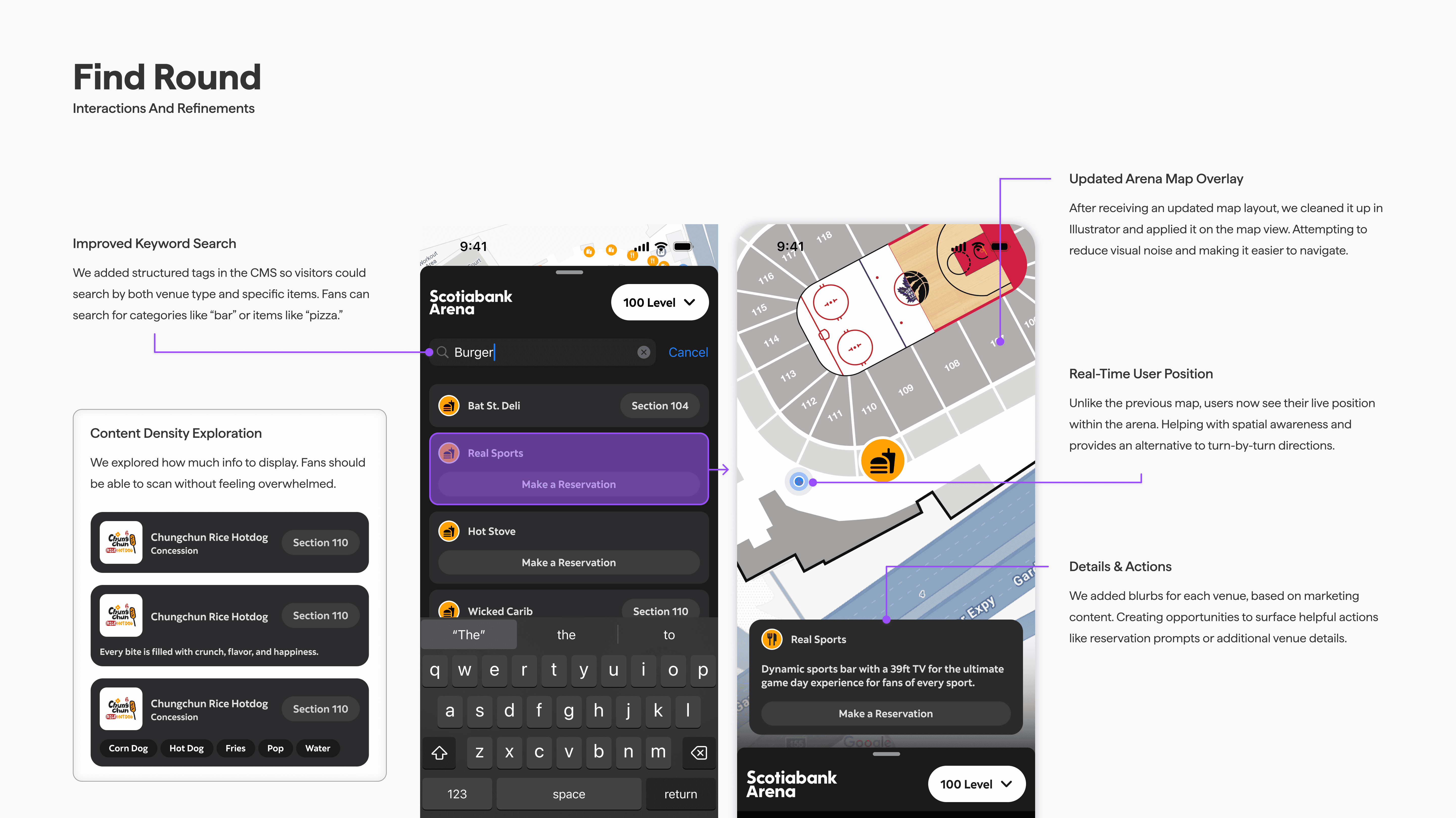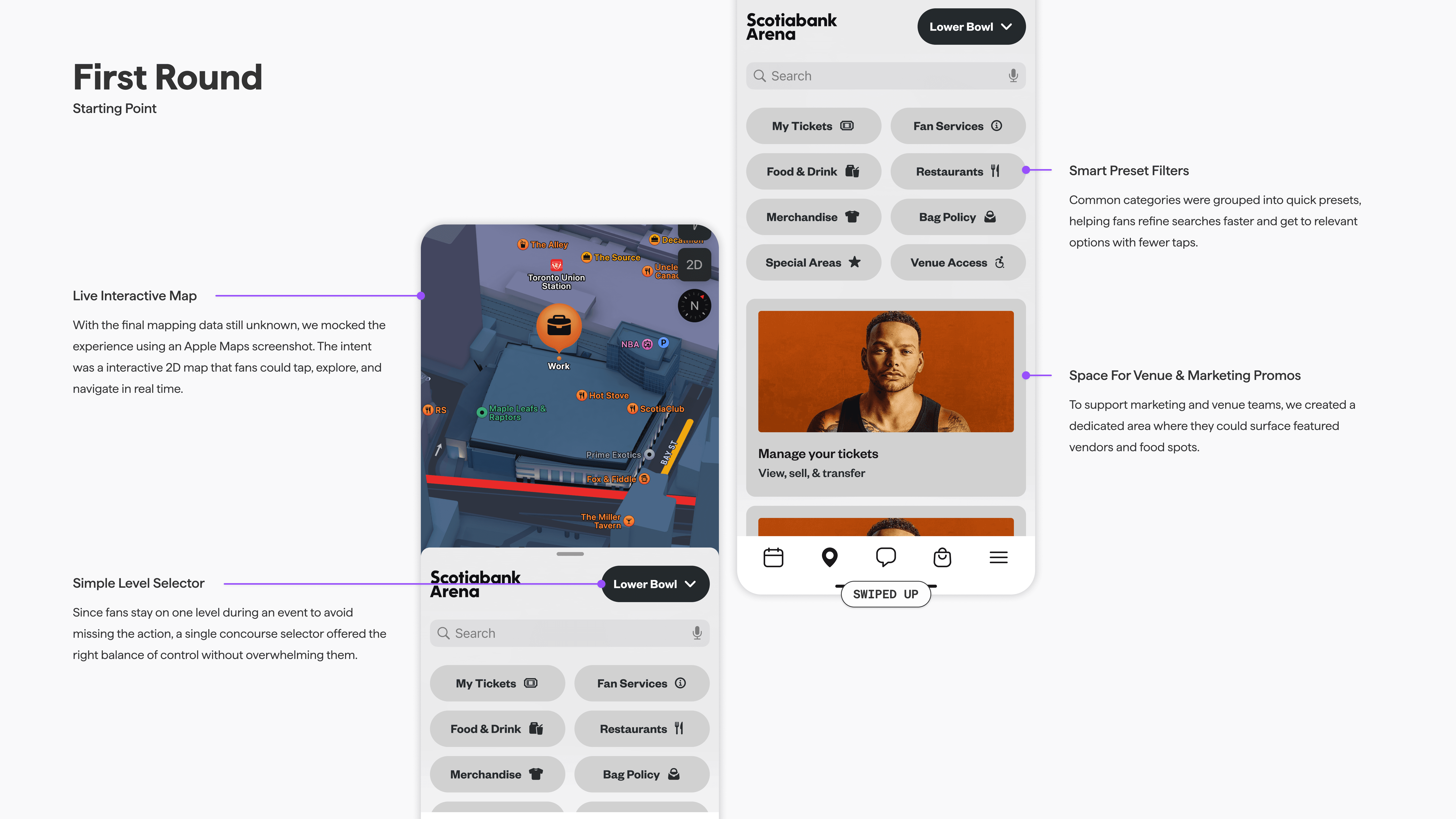 The previous venue map was largely informational and didn’t reflect where fans actually were in the arena. Our goal was to make the experience more contextual and relevant. Using Google Maps and updated venue schematics, we redesigned the map to better surface vendors, shops, and points of interest around the user.