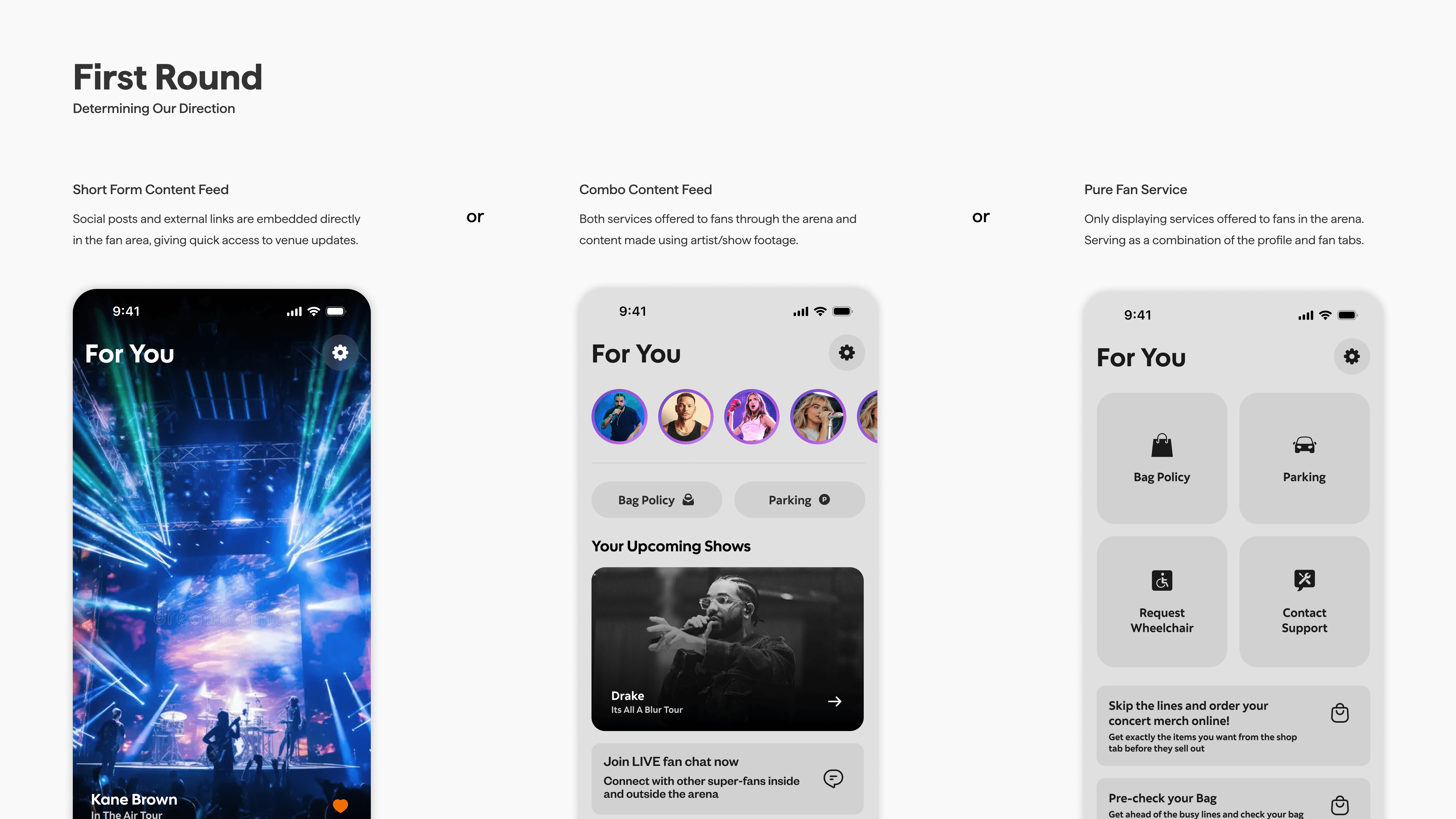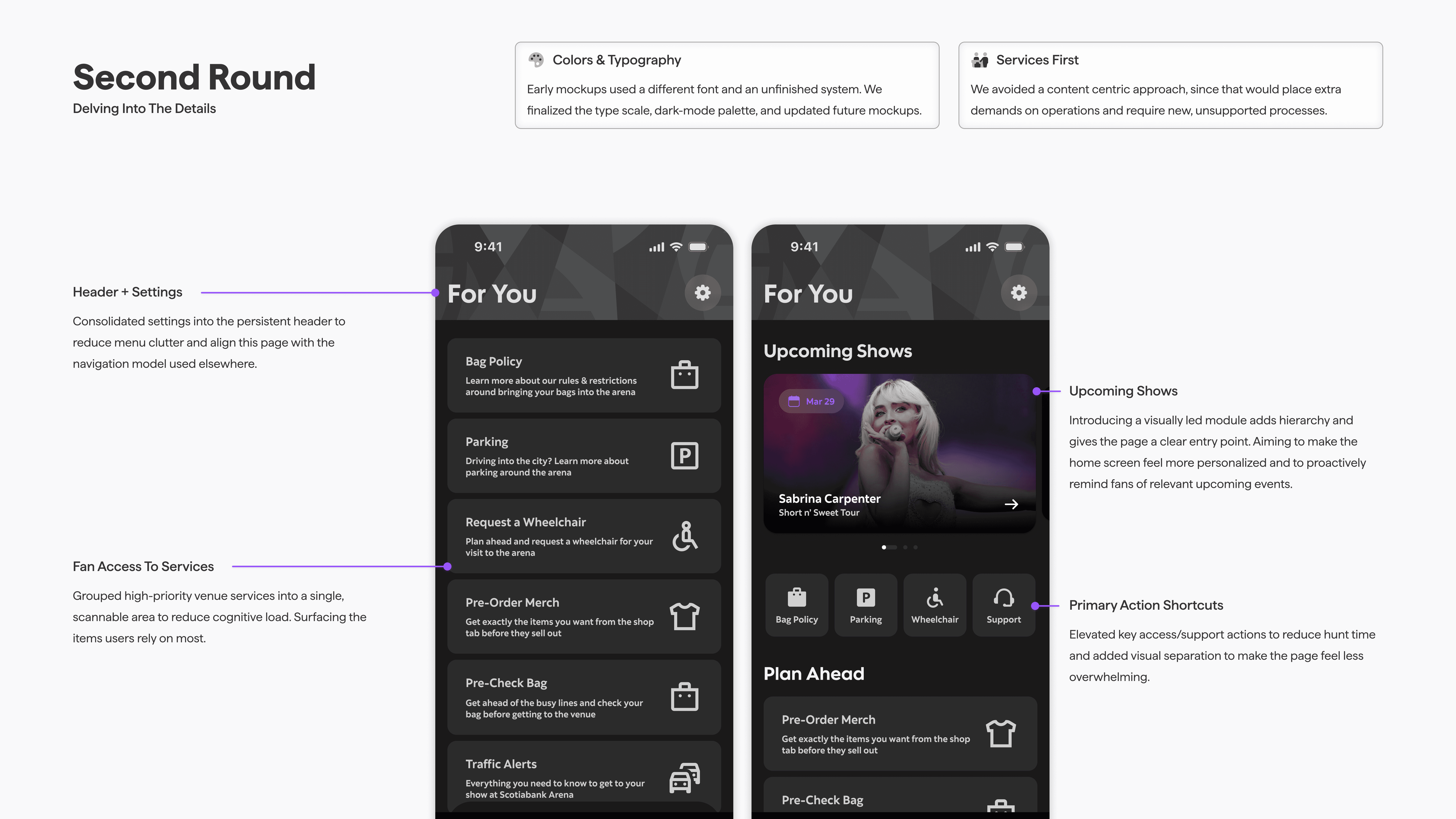 A few competing objectives led us to create a For You page. From a revenue standpoint, it became a place to highlight new tours, gift cards, and in-seat ordering. From the fan perspective, it served as a central hub for essential event day information like arrival details, parking, bag policies, and general support.